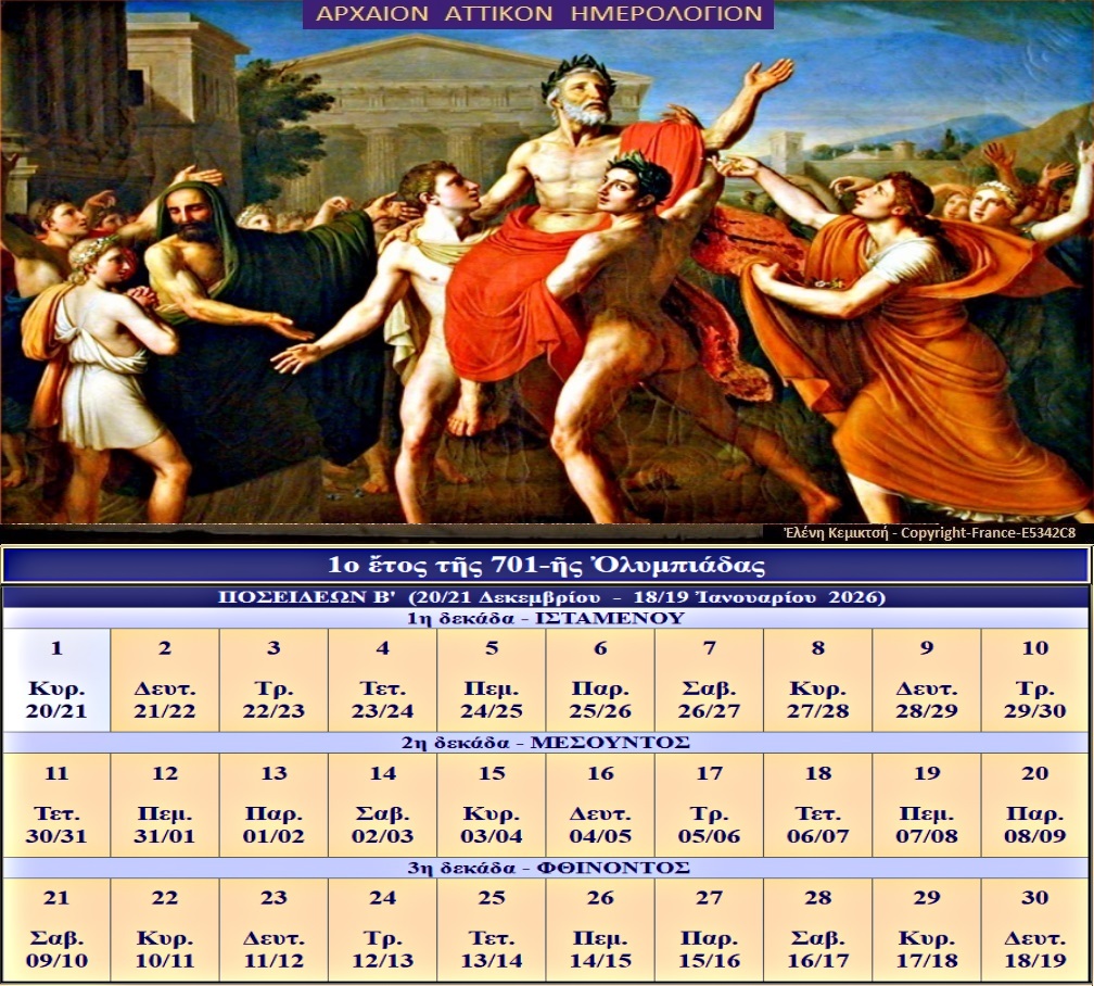 Ἡ σελίδα αὐτὴ στοχεύει νὰ δώσει ἔμφαση στὴν Ἱερότητα τῶν ἀρχαίων Ὀλυμπιακῶν Ἀγώνων μὲ τὸ Ἀττικὸ Ἡμερολόγιο. Ἡ βασική μου ἰδέα ὅταν ἀνέβασα γιὰ πρώτη φορὰ τὸ ἀρχαῖο Ἀττικὸ Ἡμερολόγιο τὸ 2011 -2012 ἦταν ἡ ἀναβίωση τοῦ Ἀττικοῦ Ἡμερολογίου ὡς ἐπίσημο ἡμερολόγιο τῶν σύγχρονων Ὀλυμπιακῶν Ἀγώνων. Ἡ ἐργασία μου γιὰ τὴν ἀναβίωση τοῦ Ἀττικοῦ Ἡμερολόγιο ἔχει κατατεθεῖ ἀπὸ τὸ 2012 στὸ Copyright France © Dépôt officiel E5342C8. Καλῶς ἦλθες ἐν τῷ ἱστοχώρῳ τοῦ Ἀττικοῦ Ἡμερολογίου !!